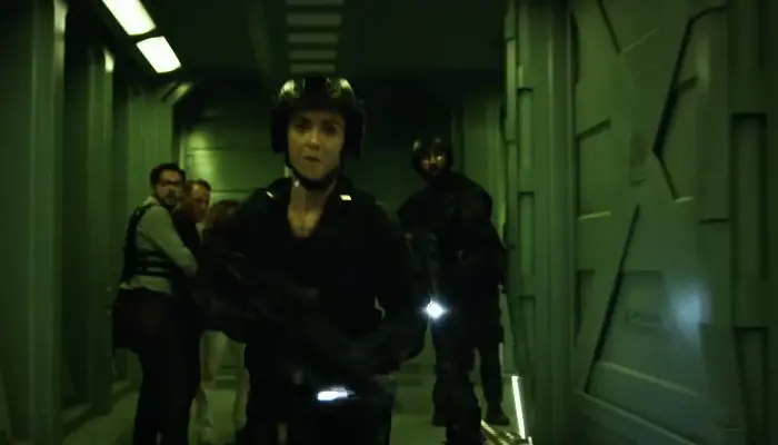 Типа ходячие мертвецы на космической базе, только они не ходячие, а прыгающие и дерущиеся. Такой себе классический фантастический боевичек аля 1980-е, и спецэффекты примерно того же качества. Всё академично, гламурный спецназ в чистенькоф форме. Напоминает крысу из нержавеющей стали, или даже игру про императора-трупа, ну, там ещё коммисар Каин, Юрген и симпатичная инквизиторша.